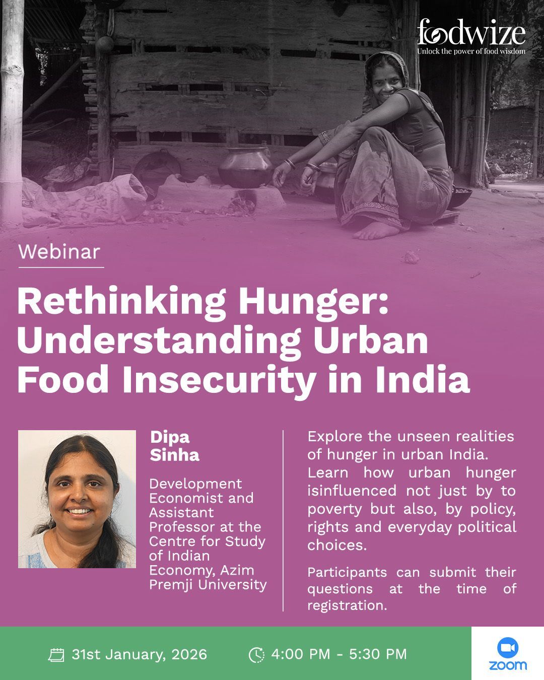 This webinar explores the invisible realities of hunger in urban India. Through a conversation with development economist Dipa Sinha, we unpack how food insecurity is shaped not only by poverty, but by policy, rights and everyday political choices. Participants will gain a deeper understanding of ‘silent hunger’ and urban vulnerability.